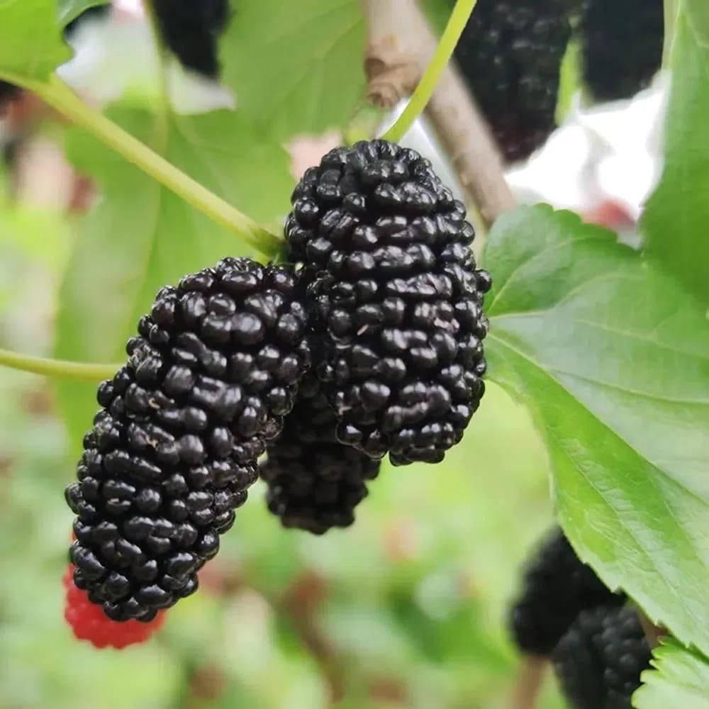 ブラックマルベリーは熟すと黒っぽい紫色を帯び、濃厚な甘みとやや強めの酸味が特長です。生で食べても美味しく、ジャムなどの加工にも適しているため汎用性が高いと言われます。色素成分のアントシアニンを多く含むため、抗酸化作用も期待できます。
