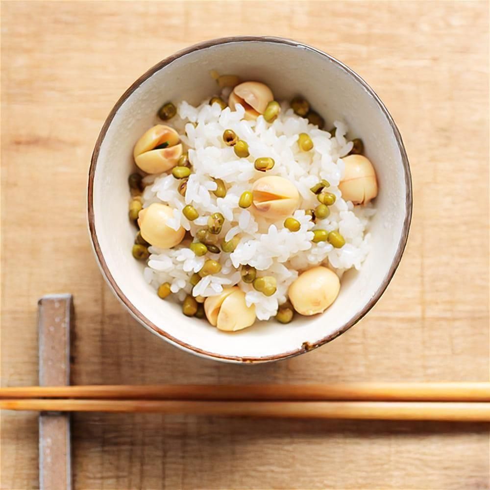4. 米を通常通り洗い、炊飯器にセットします。水加減は少し多めに! 蓮の実と緑豆(柔らかめがお好みの場合は事前に戻しておくと良いです)を上に乗せて炊くだけで完成です♪