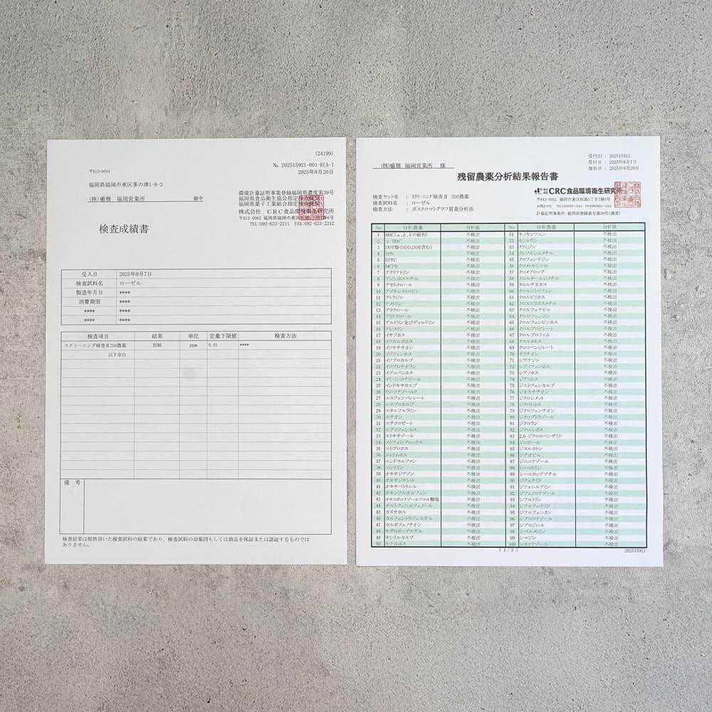 癒雅のローゼルは、美しく豊かな自然環境に恵まれた雲南高原で大切に育てられています。さらに日本国内の公的機関にて、厳格な残留農薬検査(250項目)を実施し、すべて「検出なし」を確認済み。安心してお召し上がりいただけます。