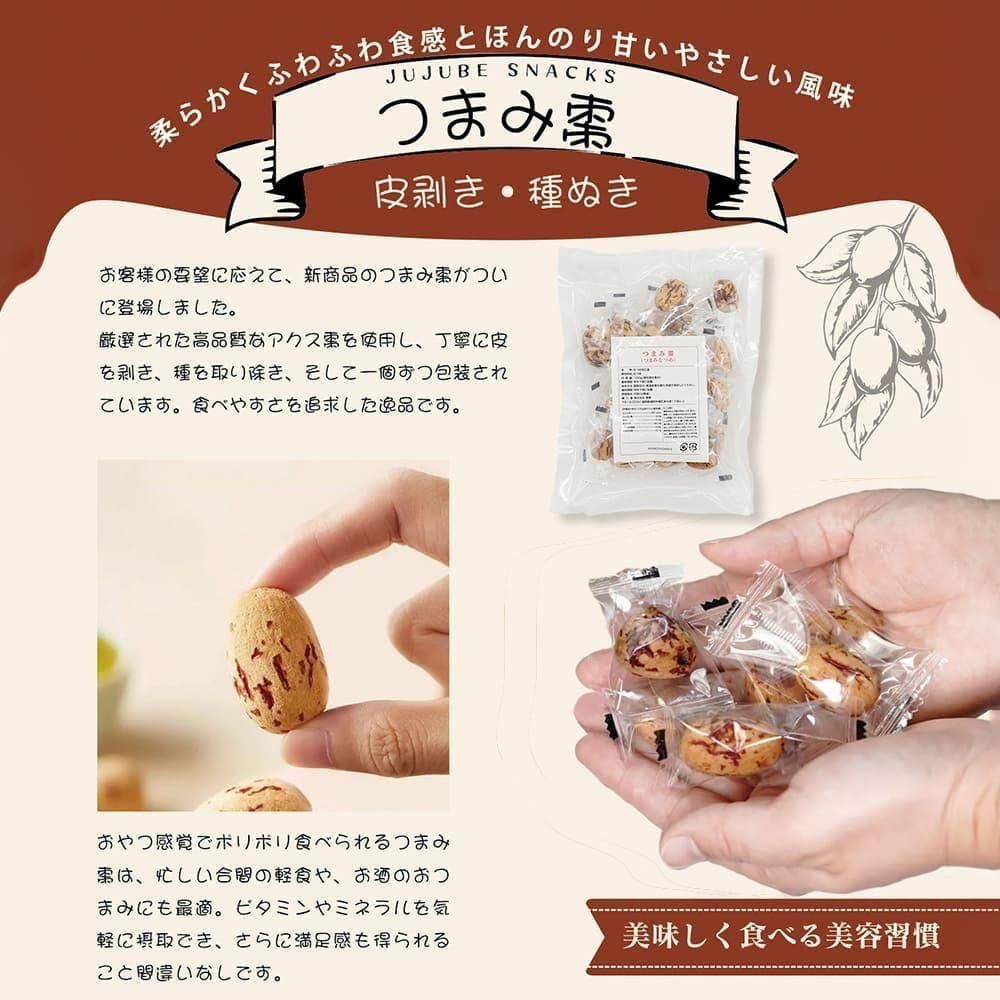 お客様の要望に応えて、新商品のつまみ棗がついに登場しました。厳選された高品質なアクス棗を使用し、丁寧に皮を剥き、種を取り除き、そして一個ずつ包装されています。食べやすさを追求した逸品です。