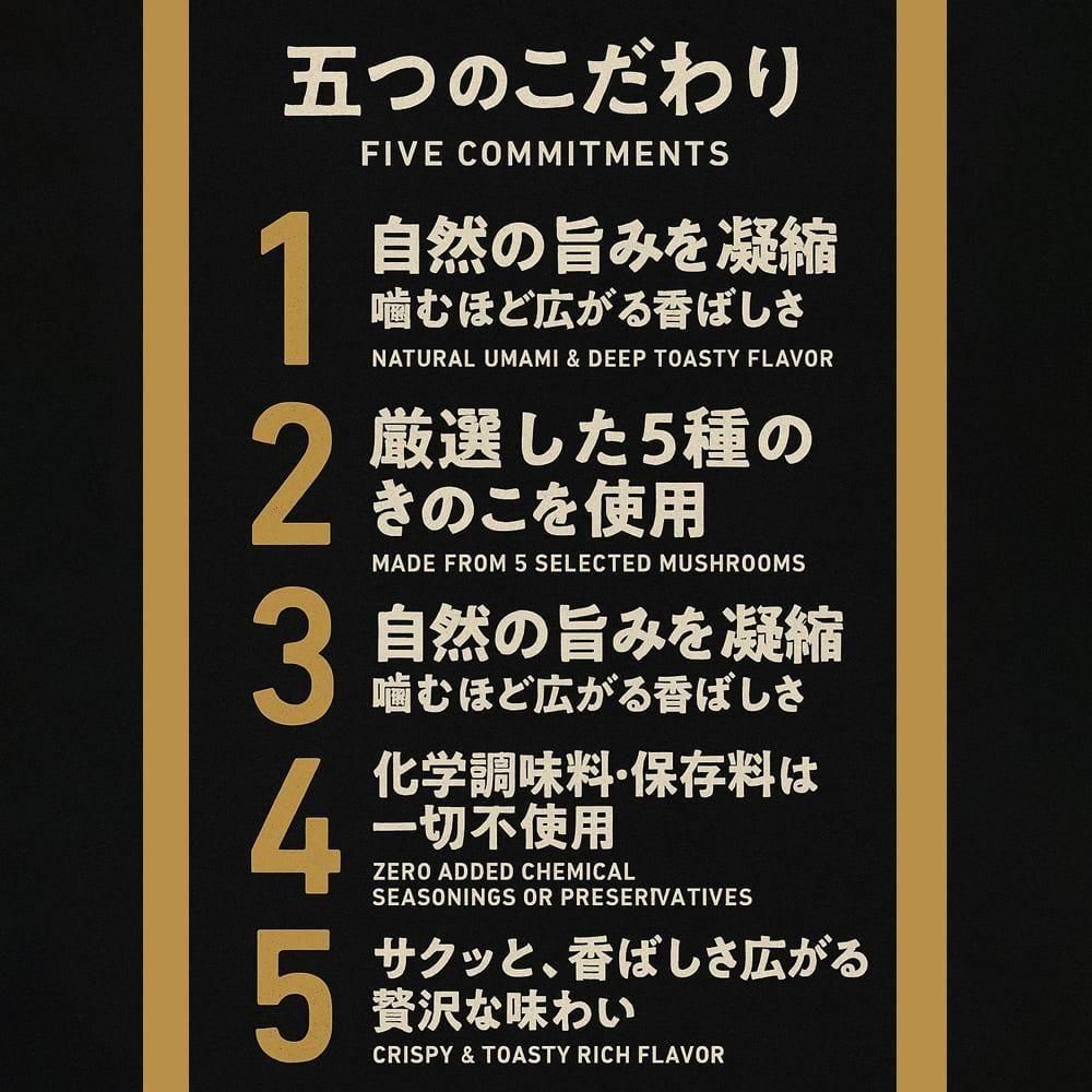 半年に及ぶ開発と数えきれない試作の末、辿り着いた答えは 真空低温フライ製法。きのこの滋味と香りを逃さず閉じ込め、驚くほどサクサクとした軽やかさを実現しました。