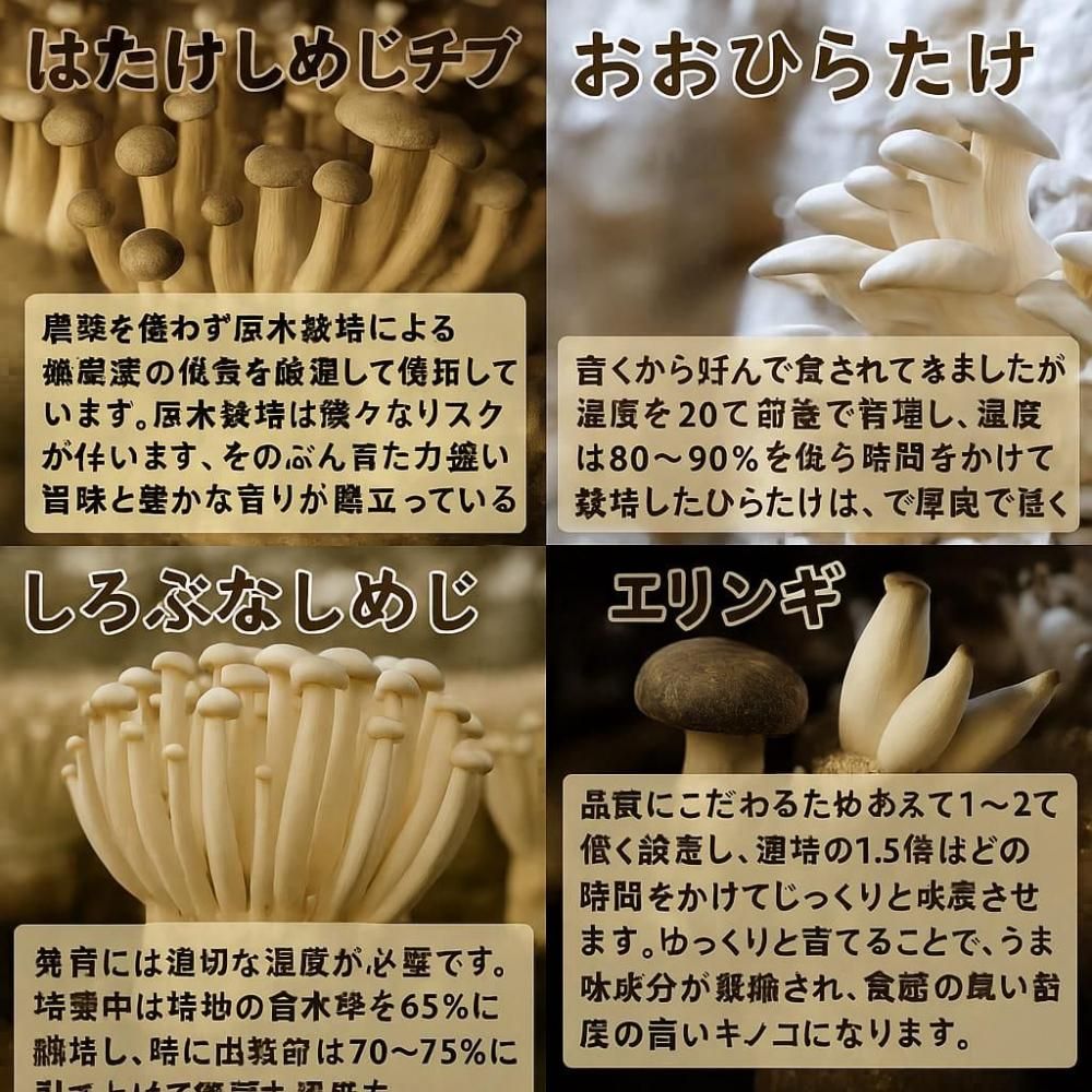 • 原材料:椎茸、エリンギ、おおひらたけ、しろぶなしめじ、はたけしめじ、植物油、食塩、麦芽糖