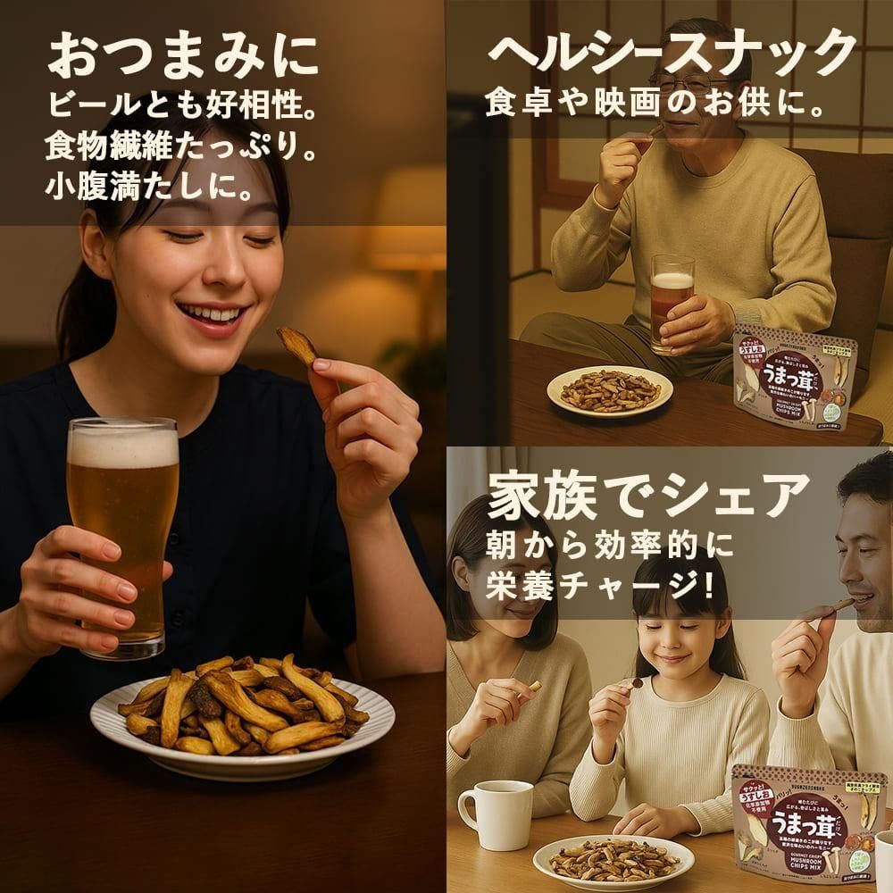 低温・短時間で水分だけを抜き、風味・香り・栄養をキープ。まるで「きのこをそのままかじる」新体験。